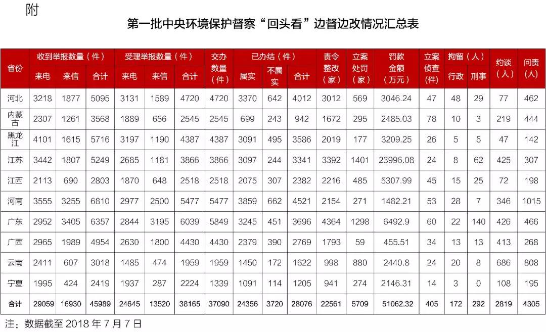 經(jīng)黨中央、國(guó)務(wù)院批準(zhǔn),第一批中央環(huán)境保護(hù)督察“回頭看”6個(gè)督察組于2018年5月30日至6月7日陸續(xù)對(duì)河北、內(nèi)蒙古、黑龍江、江蘇、江西、河南、廣東、廣西、云南、寧夏等10?。▍^(qū))實(shí)施督察進(jìn)駐。截至7月7日,全部完成督察進(jìn)駐工作。